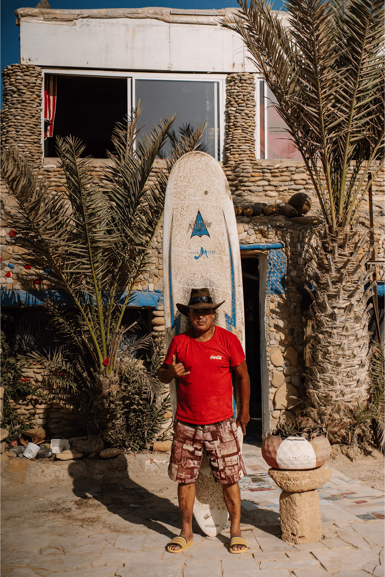 Abdellah est un ancien longboardeur marocain des années 80-90 qui a toujours fait beaucoup avec très peu de moyens. Outre le fait de se démener pour participer à des compétitions internationales, il monte au début des années 2000 un surf camp solidaire près de Taghazout, face au spot de Banana Point. Son idée : un lieu dédié aux locaux, permettant notamment aux jeunes de surfer gratuitement en échange d’une session de ramassage de déchets. Un projet adoubé par le roi, mais sans aide financière. Bien que sa plage ait été officiellement élue « plage la plus propre du Maroc » et qu’il ait vu passer une bonne partie des nouveaux profs de surf de la région, Abdellah n'est plus en mesure de renouveler son matériel vieillissant, ni d'entretenir son club qui subit les ravages du temps et de l’océan auquel il fait face.
