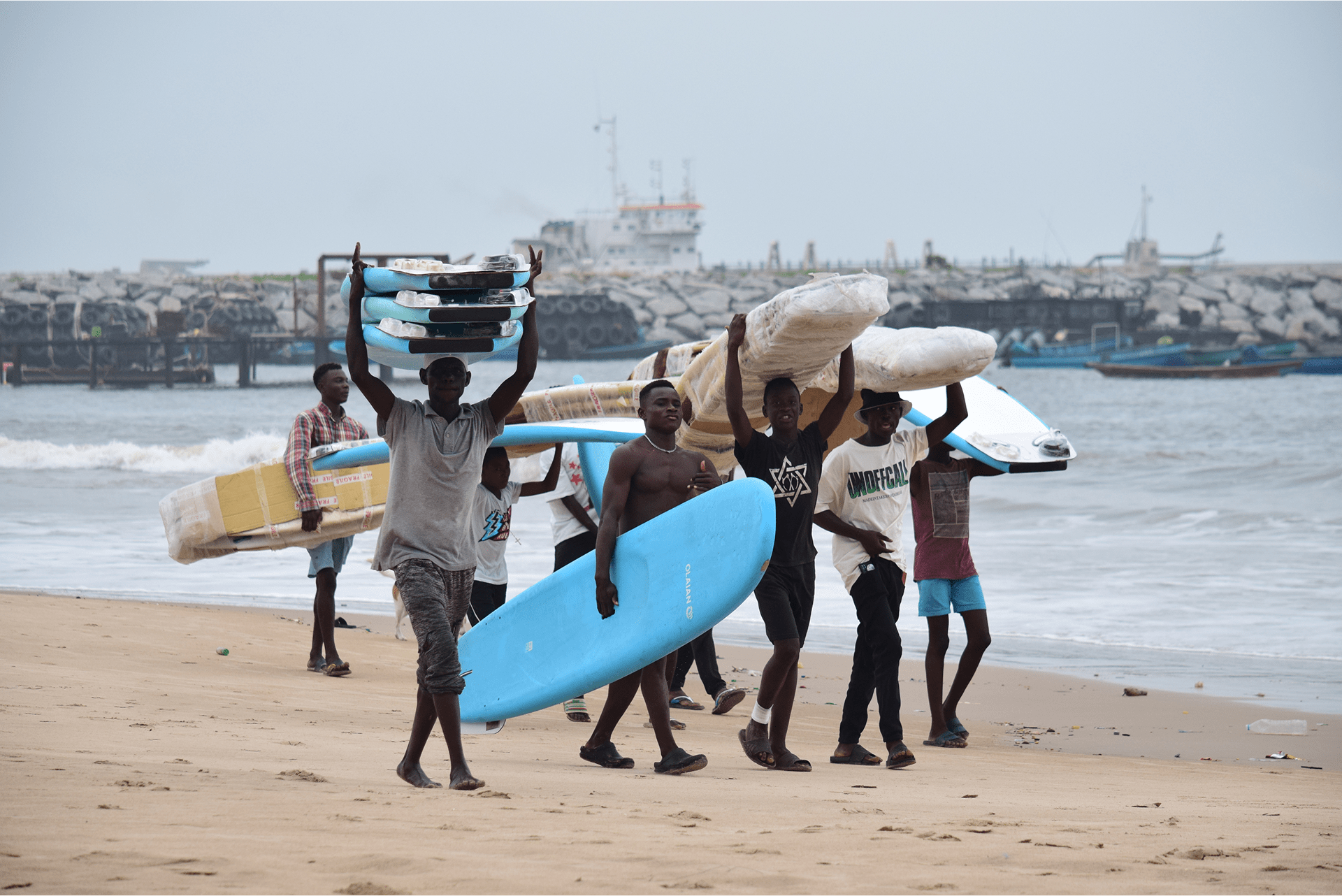 Le projet d'autonomisation par le surf sur l'île de Lagos au Nigeria part de la constatation de la vulnérabilité d'une partie de la jeunesse locale qui grandit sans perspective de vie, mais aussi du potentiel territorial local pour le développement du surf et du rôle du surf comme vecteur de mieux vivre. Le surf peut jouer un rôle significatif dans l’amélioration des conditions de vie, mais les capacités et les moyens financiers dont La Fédération de Surf du Nigéria (NSF) dispose ne sont pas suffisants pour soutenir ses activités avec les jeunes et développer l’offre touristique. En consultation avec nos partenaires locaux, nous avons proposé de travailler au renforcement des capacités de la NSF, par une participation à la construction d'un circuit économique local de tourisme et à la structuration des cours et des entraînements. L’offre de cours de surf aux touristes permettrait à la Fédération de financer ses activités dirigées vers la jeunesse locale.